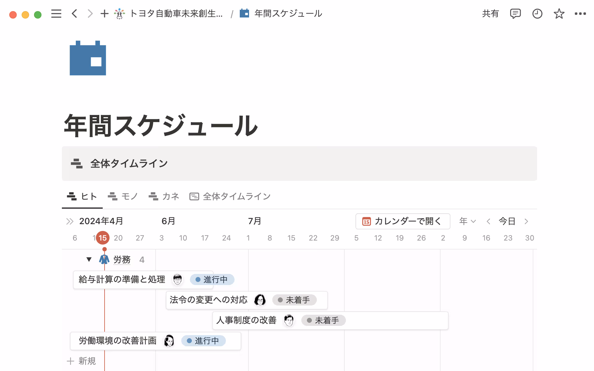 Notionの更新の簡単さはスケジュール管理にぴったり。タイムラインだけでなく、担当者やステータスも表示。